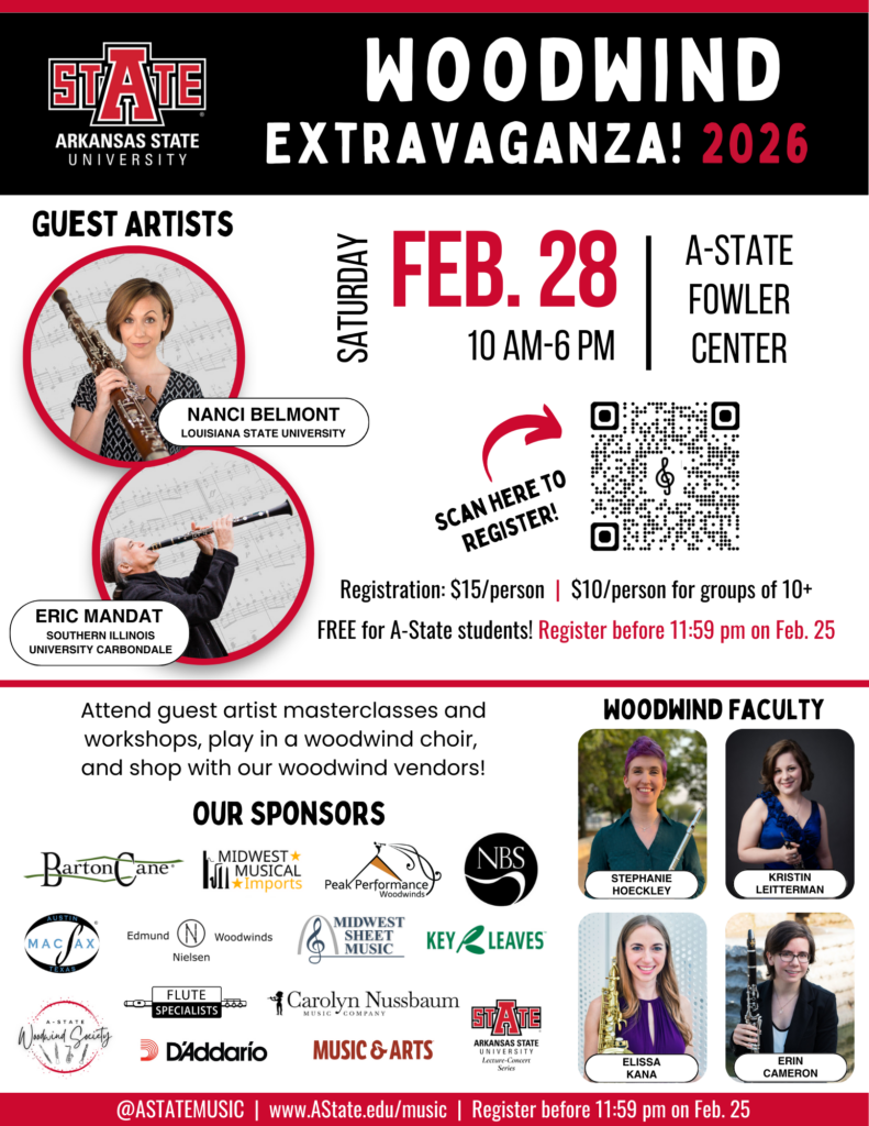 Join us for the Woodwind Extravaganza on Saturday, February 28, 2026! We have an exciting day planned for woodwind players from around Arkansas and the Mid-South Region.